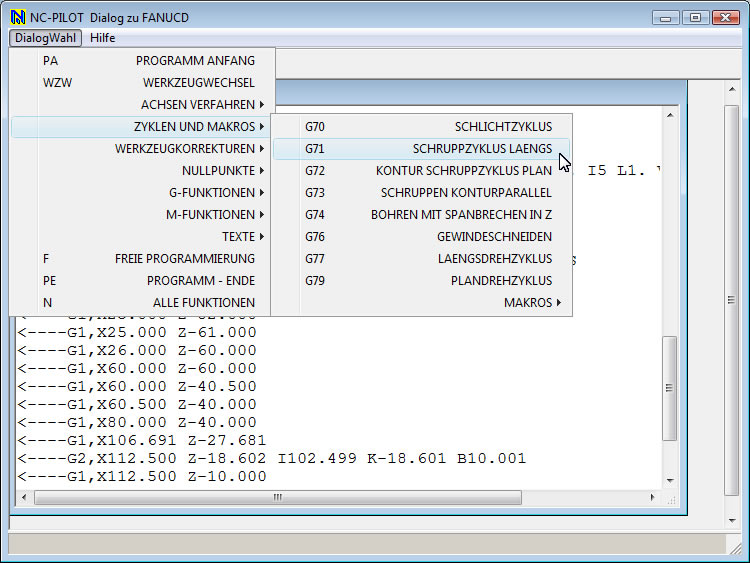 bzw. den Menüpunkt „Längsschruppen“ über die Auswahlliste "Zyklen"